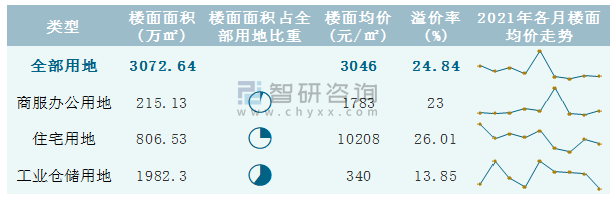 根據(jù)國(guó)信房地產(chǎn)信息網(wǎng)數(shù)據(jù)統(tǒng)計(jì)可知:2021年9月寧波市全部用地出讓地面均價(jià)為3732元/㎡,其中住宅用地出讓地面均價(jià)最高(13166元/㎡),全部用地成交地面均價(jià)為2811元/㎡,其中住宅用地成交地面均價(jià)為11960元/㎡,高于商服辦公用地成交地面均價(jià);2021年1-9月寧波市工業(yè)倉(cāng)儲(chǔ)用地樓面面積占其全部用地比重最多,為64.51%,溢價(jià)率為13.85%。