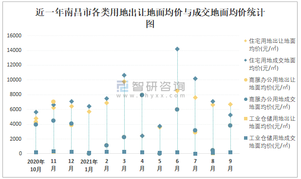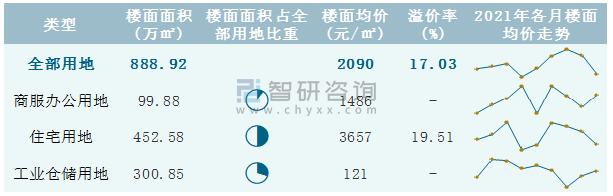根據國信房地產信息網數據統計可知:2021年9月南昌市全部用地出讓地面均價為2319元/㎡,其中住宅用地出讓地面均價最高(6669元/㎡),全部用地成交地面均價為1695元/㎡,其中住宅用地成交地面均價為5243元/㎡,高于商服辦公用地成交地面均價;2021年1-9月南昌市住宅用地樓面面積占其全部用地比重最多,為50.91%,溢價率為19.51%。