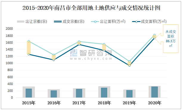 2015-2020年南昌市全部用地土地供應與成交情況統計圖