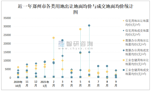 近一年鄭州市各類用地出讓地面均價與成交地面均價統計圖