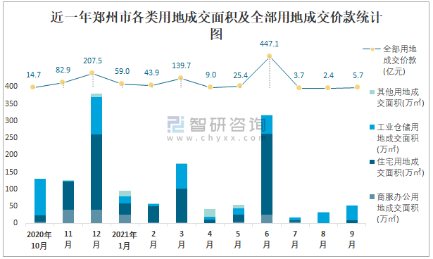 近一年鄭州市各類用地成交面積及全部用地成交價款統計圖