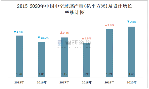 2015-2020年中國中空玻璃產(chǎn)量及累計增長率統(tǒng)計圖