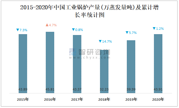 2015-2020年中國工業鍋爐產量及累計增長率統計圖