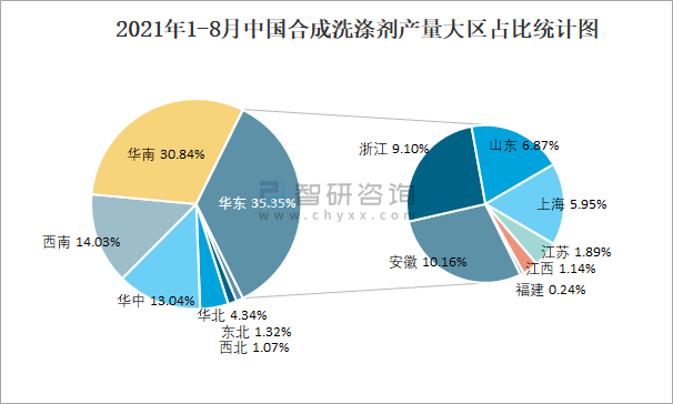 2021年1-8月中國合成洗滌劑產量大區占比統計圖
