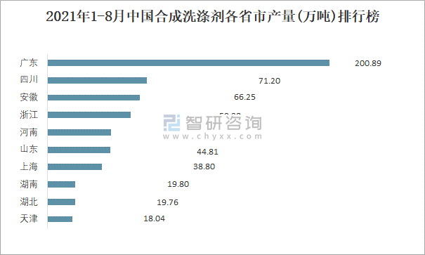 2021年1-8月中國合成洗滌劑各省市產量排行榜