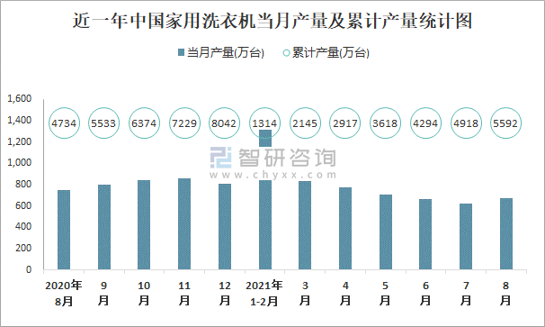 根據國家統計局數據顯示:2021年8月中國家用洗衣機產量為674萬臺,同比下降10%;2021年1-8月中國家用洗衣機累計產量為5591.5萬臺,累計增長22.6%;2015-2020年中國家用洗衣機產量2018年起逐年遞增,2020年達到最大值。