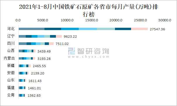 2021年1-8月中國鐵礦石原礦各省市每月產量排行榜