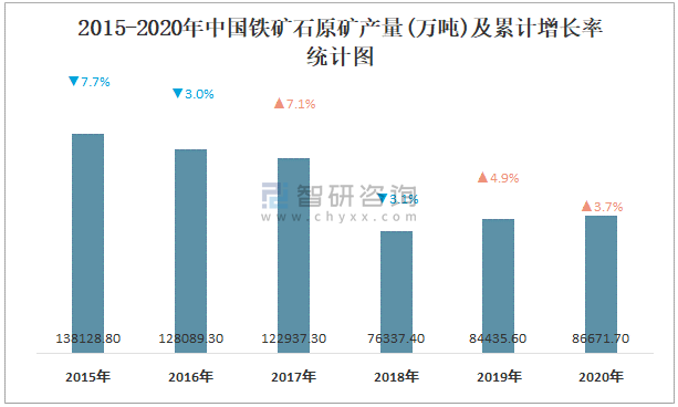 2015-2020年中國鐵礦石原礦產量及累計增長率統計圖