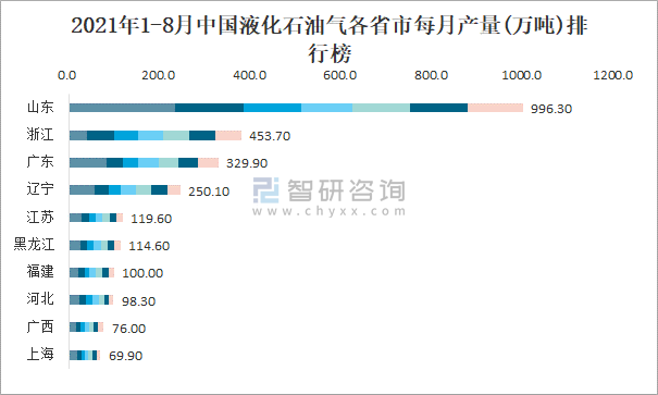 2021年1-8月中國液化石油氣各省市每月產(chǎn)量排行榜