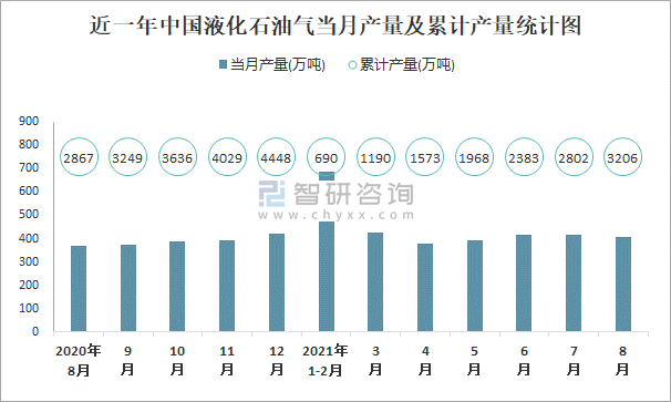 近一年中國液化石油氣當(dāng)月產(chǎn)量及累計產(chǎn)量統(tǒng)計圖
