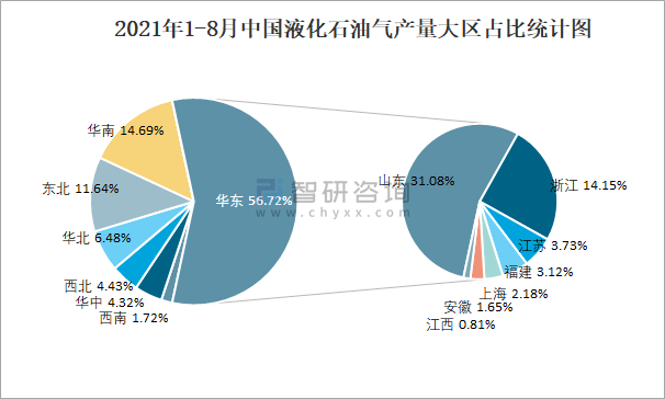 2021年1-8月中國液化石油氣產(chǎn)量大區(qū)占比統(tǒng)計圖