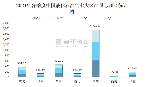 2021年各季度中國液化石油氣七大區(qū)產(chǎn)量統(tǒng)計圖