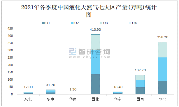 2021年各季度中國液化天然氣七大區(qū)產(chǎn)量統(tǒng)計圖