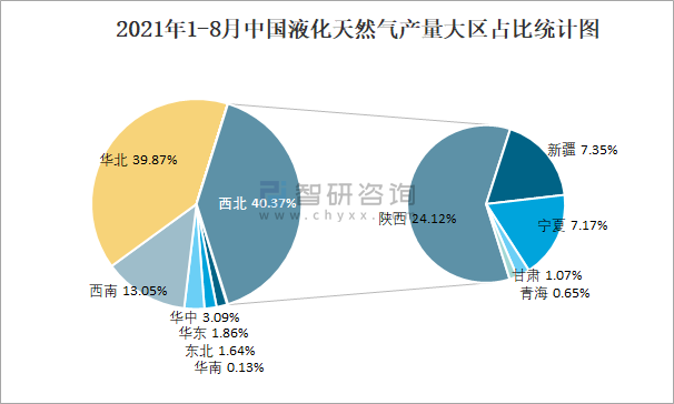 2021年1-8月中國液化天然氣產(chǎn)量大區(qū)占比統(tǒng)計圖