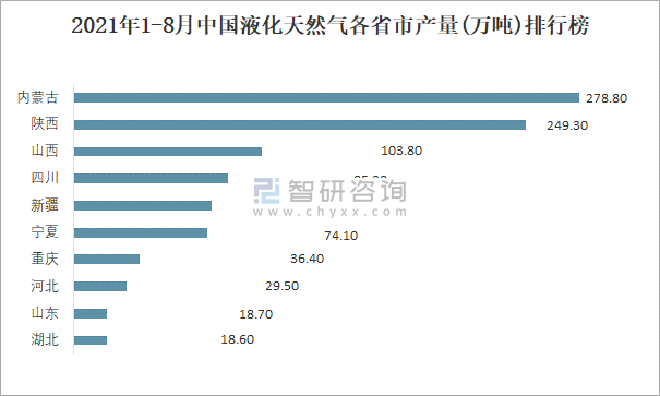 2021年1-8月中國液化天然氣各省市產(chǎn)量排行榜
