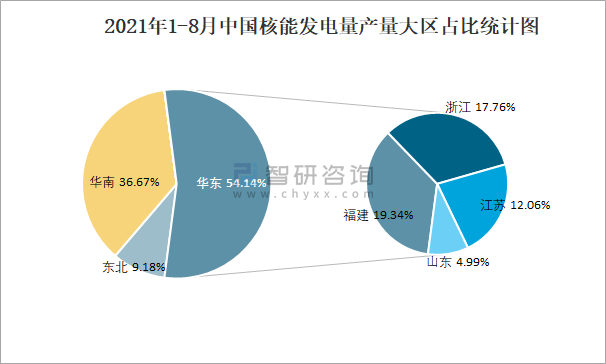 2021年1-8月中國核能發電量產量大區占比統計圖