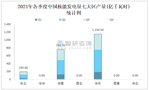 2021年各季度中國核能發電量七大區產量統計圖