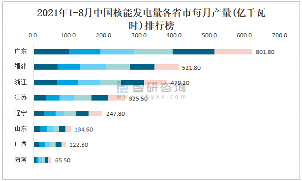 2021年1-8月中國核能發電量各省市每月產量排行榜