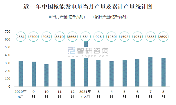 近一年中國核能發電量當月產量及累計產量統計圖