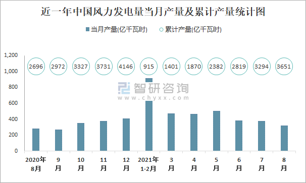近一年中國風(fēng)力發(fā)電量當(dāng)月產(chǎn)量及累計產(chǎn)量統(tǒng)計圖