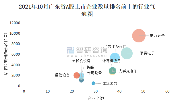 2021年10月廣東省A股上市企業(yè)數(shù)量排名前十的行業(yè)氣泡圖