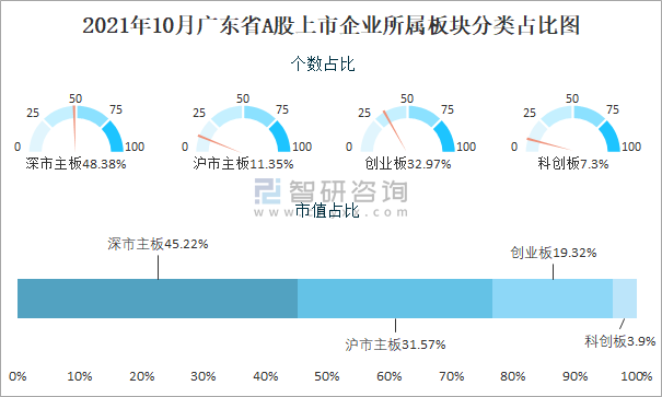 2021年10月廣東省A股上市企業(yè)所屬板塊分類(lèi)占比圖