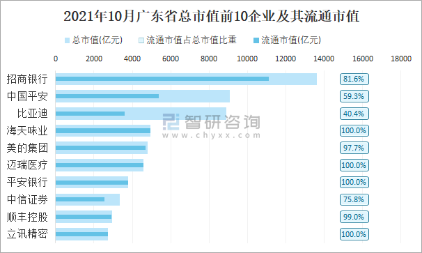 2021年10月廣東省總市值前10企業(yè)及其流通市值
