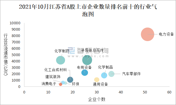 2021年10月江蘇省A股上市企業數量排名前十的行業氣泡圖
