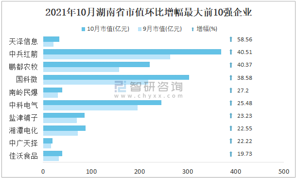 據同花順統計數據可知:相較于2021年9月,湖南省10月有38家企業總市值呈現不同程度的增長,1家企業增幅超過50%,其中從事互聯網電商行業的天澤信息增幅最大,增長58.56%,環比增幅最大的前10強企業中,從事國防軍工行業的中兵紅箭增量最大,總市值增加106.67億元;4家企業總市值無明顯變化;85家企業總市值環比出現下滑。