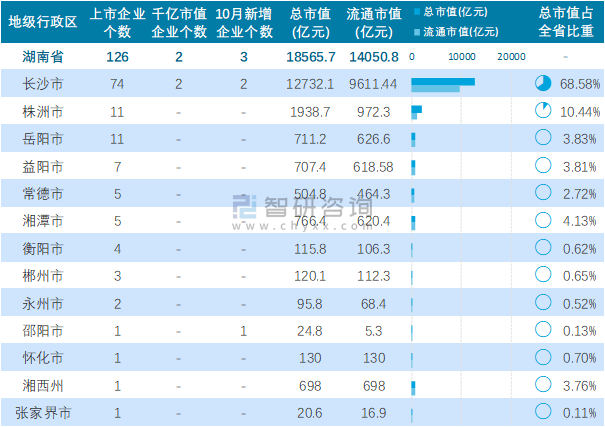 據同花順統計數據可知:10月湖南省有3家企業新上市,截止至2021年10月31日,湖南省的A股上市企業共計126家,上市企業數量排名全國第10,總市值共計18565.7億元;除婁底市1個地級行政區以外,湖南省其他13個地級行政區均有企業在A股上市,其中長沙市上市企業數量最多,為74家;湖南省的A股上市千億市值企業數量在全國排名第16,共計2家,總部均在長沙市;長沙市A股上市企業總市值和總流通市值均為最高。