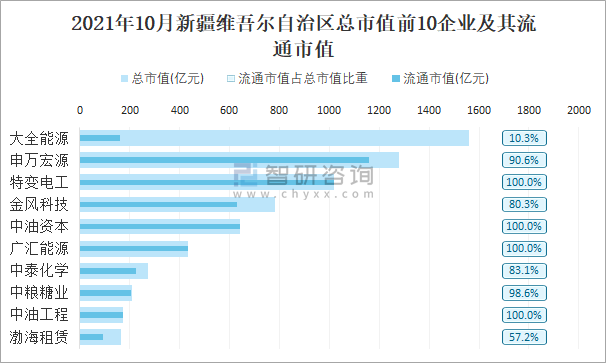 2021年10月新疆維吾爾自治區總市值前10企業及其流通市值