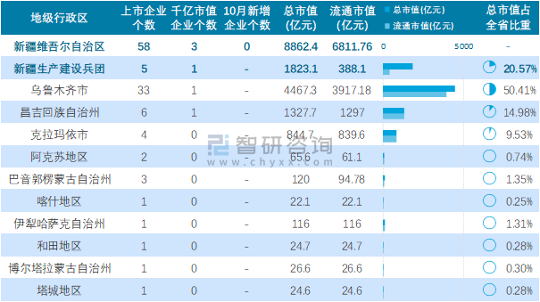 2021年10月新疆維吾爾自治區各地級市A股上市企業情況統計表