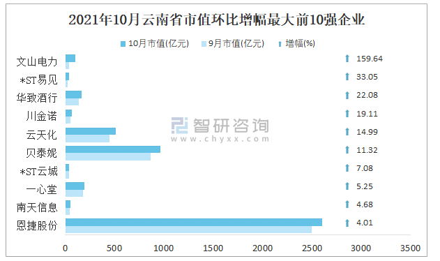 2021年10月云南省市值環比增幅最大前10強企業