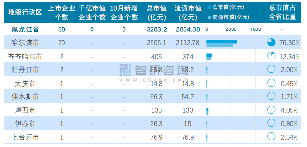 2021年10月黑龍江省38家A股上市企業總市值3283.2億元,哈爾濱上市企業數量最多