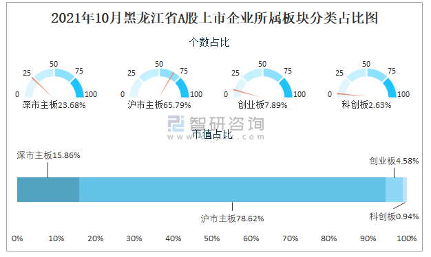 2021年10月黑龍江省A股上市企業所屬板塊分類占比圖