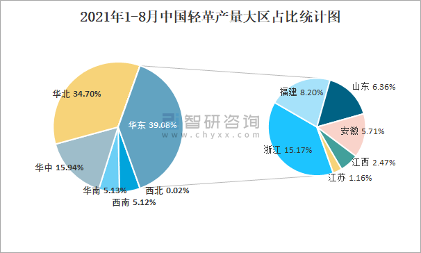 2021年1-8月中國輕革產量大區占比統計圖