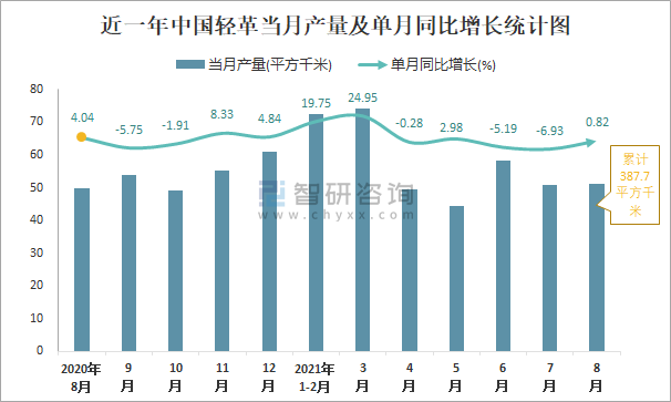 根據國家統計局數據顯示:2021年8月中國輕革產量為51.3平方千米,同比增長0.82%;2021年1-8月中國輕革累計產量為387.7平方千米,同比增長7.3%;2015-2020年中國輕革產量2018年跌至最低,此后逐年遞增。