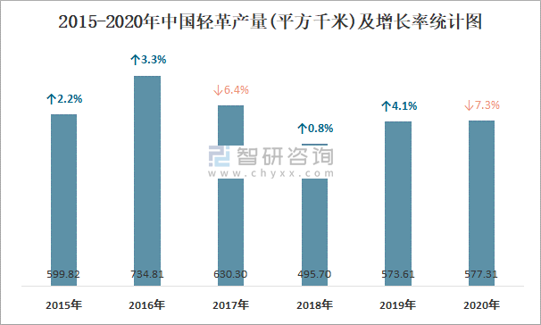 2015-2020年中國輕革產量及增長率統計圖