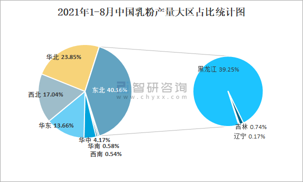 2021年1-8月中國乳粉產量大區占比統計圖
