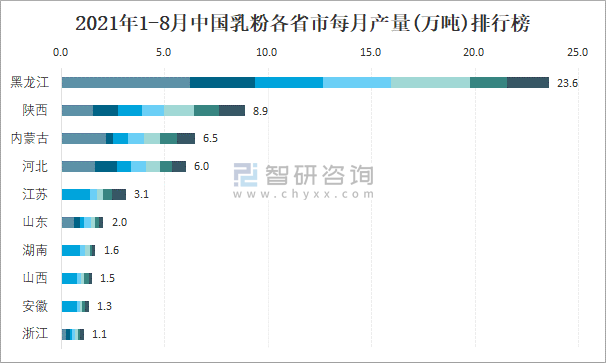 2021年1-8月中國乳粉各省市每月產量排行榜