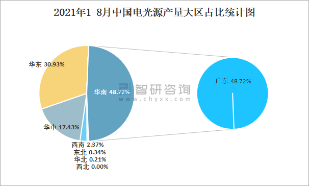2021年1-8月中國電光源產(chǎn)量大區(qū)占比統(tǒng)計圖