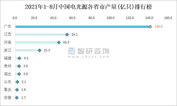 2021年1-8月中國電光源各省市產(chǎn)量排行榜