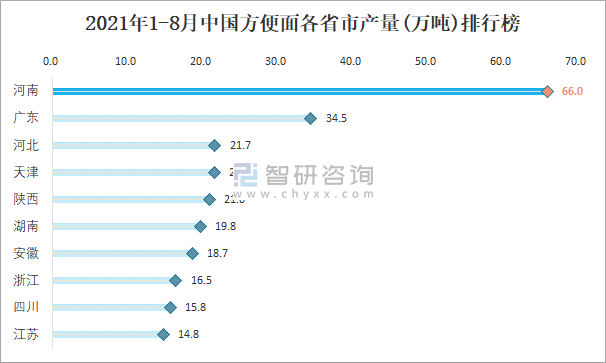 根據國家統計局數據顯示:2021年各季度(第三季度目前暫只統計7月和8月數據)中國方便面主要集中在華中、華東、華北地區生產;2021年1-8月中國方便面產量大區分布相對均衡,其中華中地區產量最高,特別是河南省貢獻了最多產量;2021年1-8月中國方便面各省產量top1遙遙領先于其他前9名。