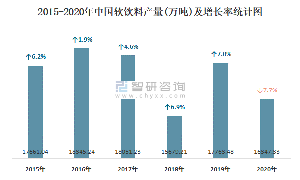 2015-2020年中國軟飲料產量及增長率統計圖