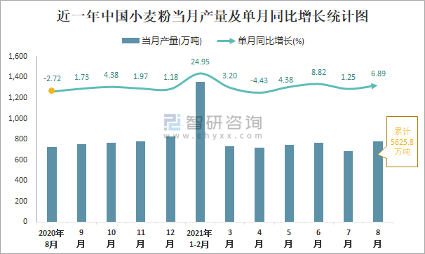 根據(jù)國家統(tǒng)計局?jǐn)?shù)據(jù)顯示:2021年8月中國小麥粉產(chǎn)量為783萬噸,同比增長6.89%;2021年1-8月中國小麥粉累計產(chǎn)量為5625.8萬噸,同比增長7.92%;2015-2020年中國小麥粉產(chǎn)量2016年達(dá)到最高,此后逐年遞減。