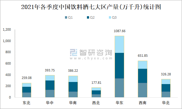 2021年各季度中國飲料酒七大區產量統計圖
