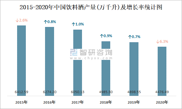 2015-2020年中國飲料酒產量及增長率統計圖