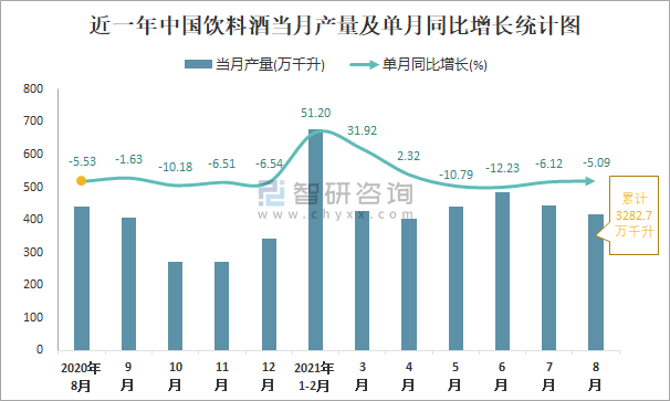 根據國家統計局數據顯示:2021年8月中國飲料酒產量為418萬千升,同比下降5.09%;2021年1-8月中國飲料酒累計產量為3282.7萬千升,同比增長6.06%;2015-2020年中國飲料酒產量逐年遞減,2020年達到最低。