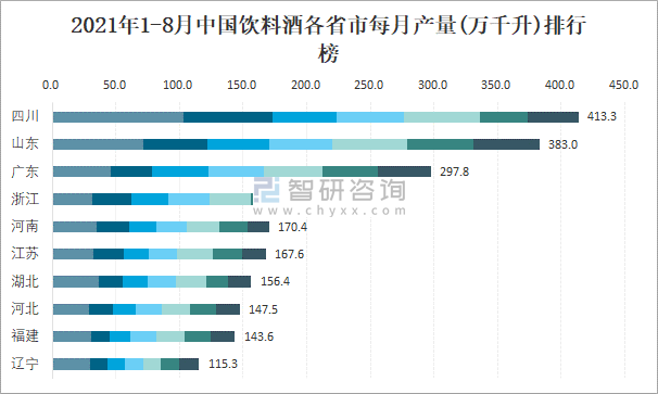 2021年1-8月中國飲料酒各省市每月產量排行榜