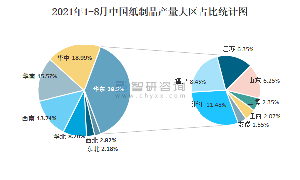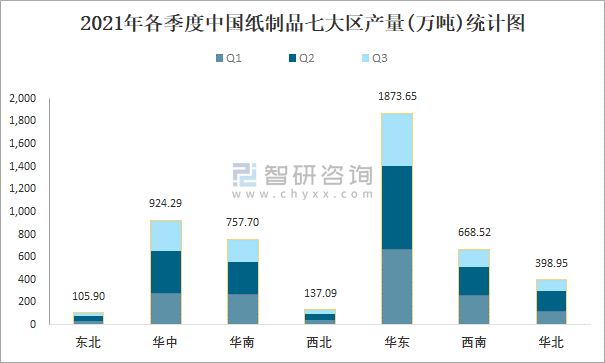 根據國家統計局數據顯示:2021年各季度(第三季度目前暫只統計7月和8月數據)中國紙制品主要集中在華東、華中、華南地區生產;2021年1-8月中國紙制品產量大區分布不均衡,其中華東地區產量最高,特別是浙江省貢獻了最多產量;2021年1-8月中國紙制品各省產量呈現梯隊式分布,廣東、浙江等省產量最多。